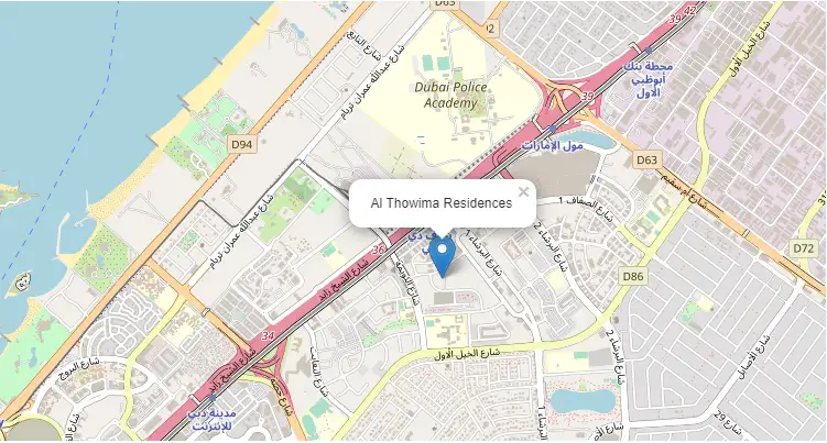 Al Thowima Residences complex is located in Al Barsha, Dubai, on Al Thowima Street with direct access to Sheikh Zayed Road, allowing residents to have access to its smooth road connection. The complex is in close proximity to Sharaf DG metro station, so transportation is not an issue. Access to various key attractions including Palm Jumeirah, Jumeirah Beach, Dubai Marina, Jebel Ali Hippodrome, Mall of Emirates, Jumeirah Village Circle, Dubai Autodrome, Dubai Sports City, iconic Burj Khalifa and many more.