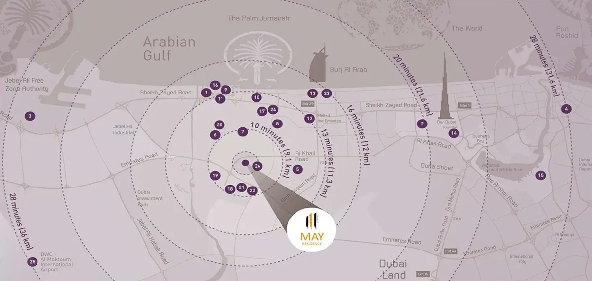 5 minutes to Dubai Sports City5 minutes to the new metro and malls15 minutes to Burj Al Arab15 minutes to Mall of the Emirates15 minutes to Dubai Marina and Palm Jumeirah15 minutes to South Dubai and Al Maktoum International Airport25 minutes to Dubai Mall and Burj Khalifa25 minutes to Dubai International Airport