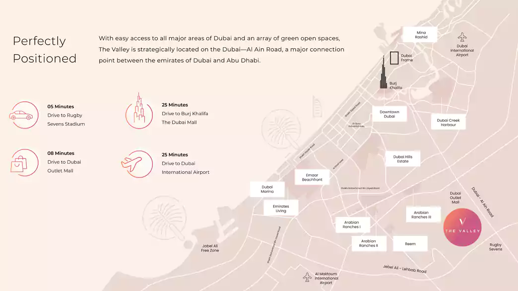 Located in The Valley, Dubai, just off Al-Ain Road, Orania Townhouses offers instant access to the rest of the region. The central location of the complex is designed to ensure that you stay connected to the rest of the destinations. At the end of the day, you'll be living in a great community with access to lush greenery and amenities that allow you to enjoy an exclusive neighborhood.