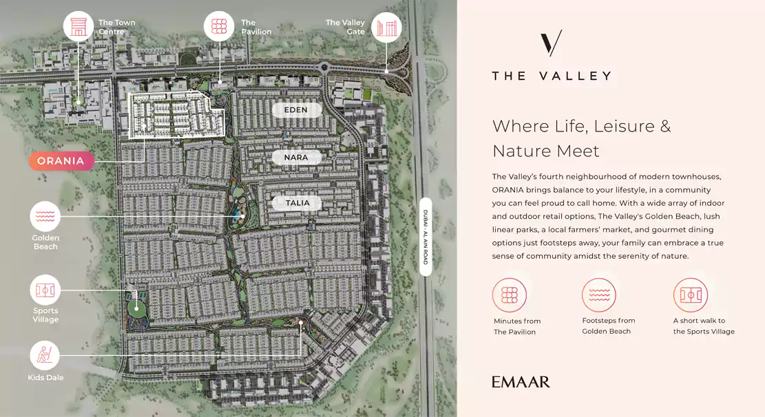 Orania at The Valley is a new apartment complex from Emaar Properties offering elegantly designed 3 and 4 bedroom townhomes in Dubai. This newest apartment complex offers a new level of sophistication and a tranquil lifestyle with access to everything on your doorstep.