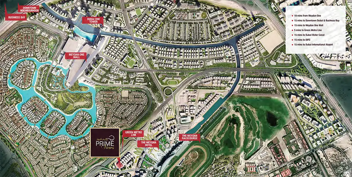 Prime Views by Prescott Real Estate Development is a modern suburban development located in the heart of Meydan Avenue, Dubai, offering 1 and 2 bedroom apartments opposite the Meydan Hotel, surrounded by the world-famous Meydan Racecourse and in close proximity to Meydan One and Downtown Dubai.