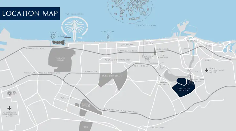 The Grand is located in the heart of the dazzling Dubai Creek harbor, one of Dubai's nine waterfront neighborhoods. Strategically located at the intersection of the waterfront between the marina and the promenade, the skyscraper is close to Al Khail Road and Ras Al Khor Road. Various key attractions, including Burj Khalifa, The Dubai Mall and Dubai International Airport, are just a few minutes away by car. The complex offers easy accessibility and mobility, offering you hassle-free accessibility thanks to seamless road networks and streetcars.