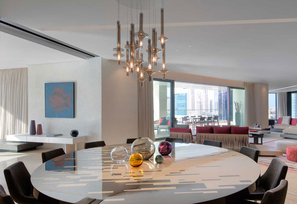 The 35-story residential tower offers a total of 45 elegantly designed apartments with views of the Dubai Canal and Burj Khalifa.