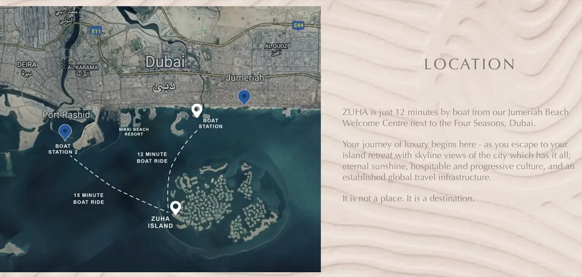 Zuha Island is located on The World Islands - Dubai, just minutes from Jumeirah Beach, Dubai. Experience the most accentuated and luxurious lifestyle, complete with the most exciting amenities and entertainment. Enjoy life in the midst of business, venture, residential and many other lifestyle-changing amenities.
