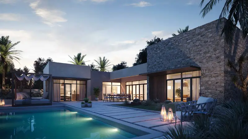 The design of the villas is inspired by the basic elements of the Arabian desert tent, which provides both shelter and shade through its modular, open and linear concept.