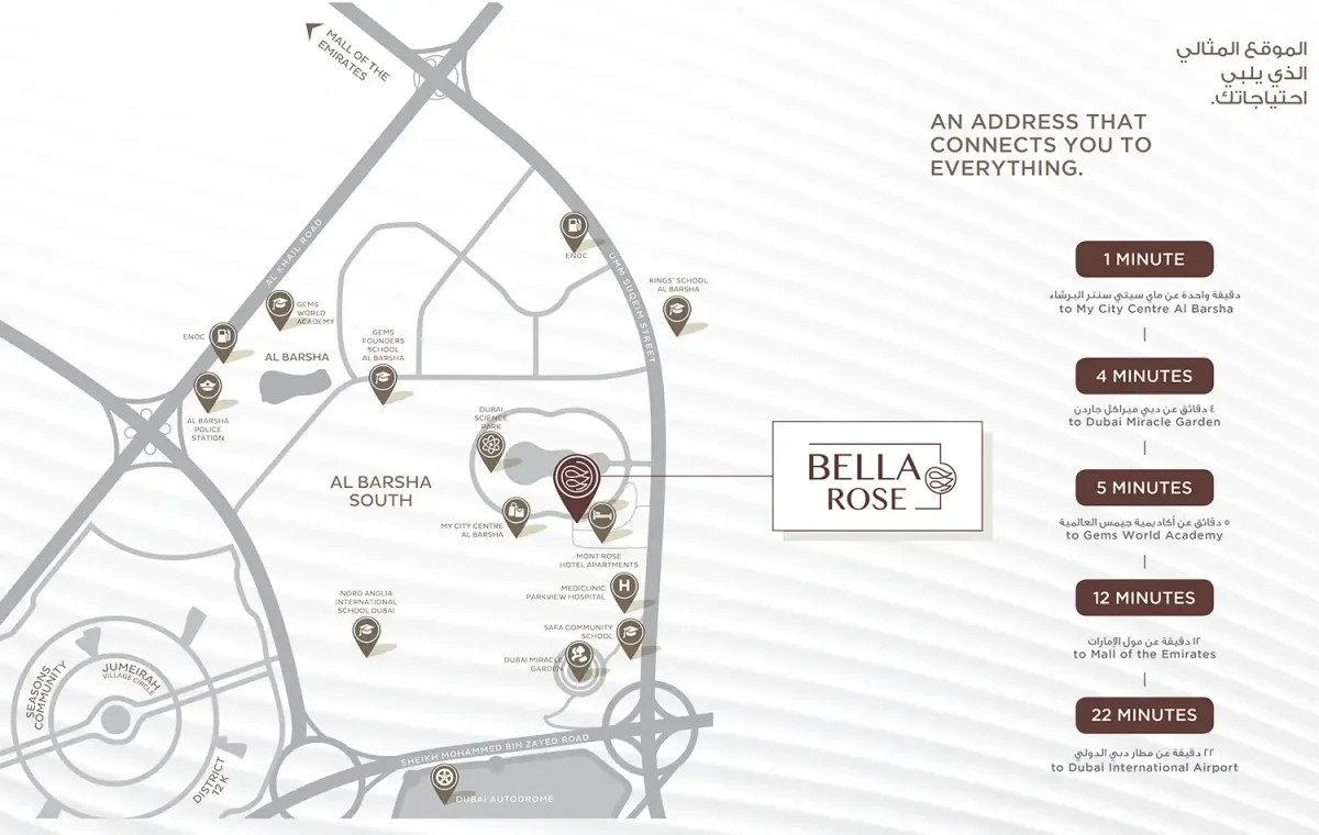 Located in Dubai Science Park in Al Barsha South, Dubai, Deyaar Bella Rose is easily accessible via Al Hail Road and Sheikh Mohammed Bin Zayed Road. With its close proximity to Mall of the Emirates and major highways, the tower has easy access to area amenities such as hotels, My City Centre Al Barsha, Miracle Garden and more. It is close to everything and within easy reach of Dubai's major road networks.1 minute from My City Centre Al Barsha4 minutes from Dubai Miracle Garden5 minutes from Gems World Academy12 minutes from Mall of the Emirates22 minutes from Dubai International Airport