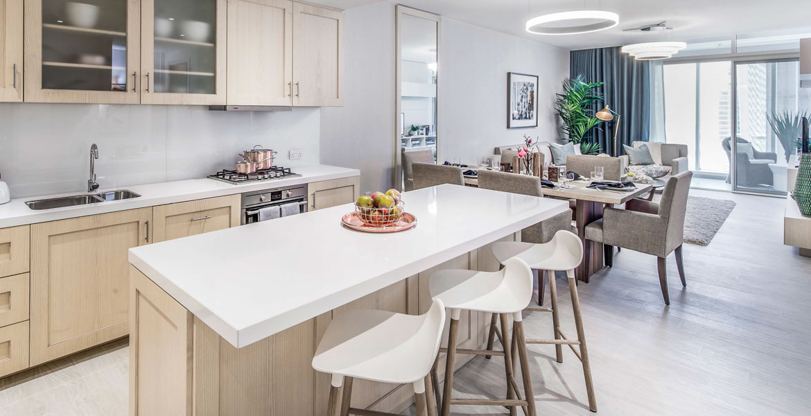 The apartments are finished in a warm gray palette, and their chic apartments showcase beautiful open kitchens with quartz countertops and contrasting gray oak wall cabinets. It offers residents tranquility and style in the heart of Emirates, on the border of Al Khail Road and Emirates Highway, while providing quick access to downtown Dubai, Marina and JLT.