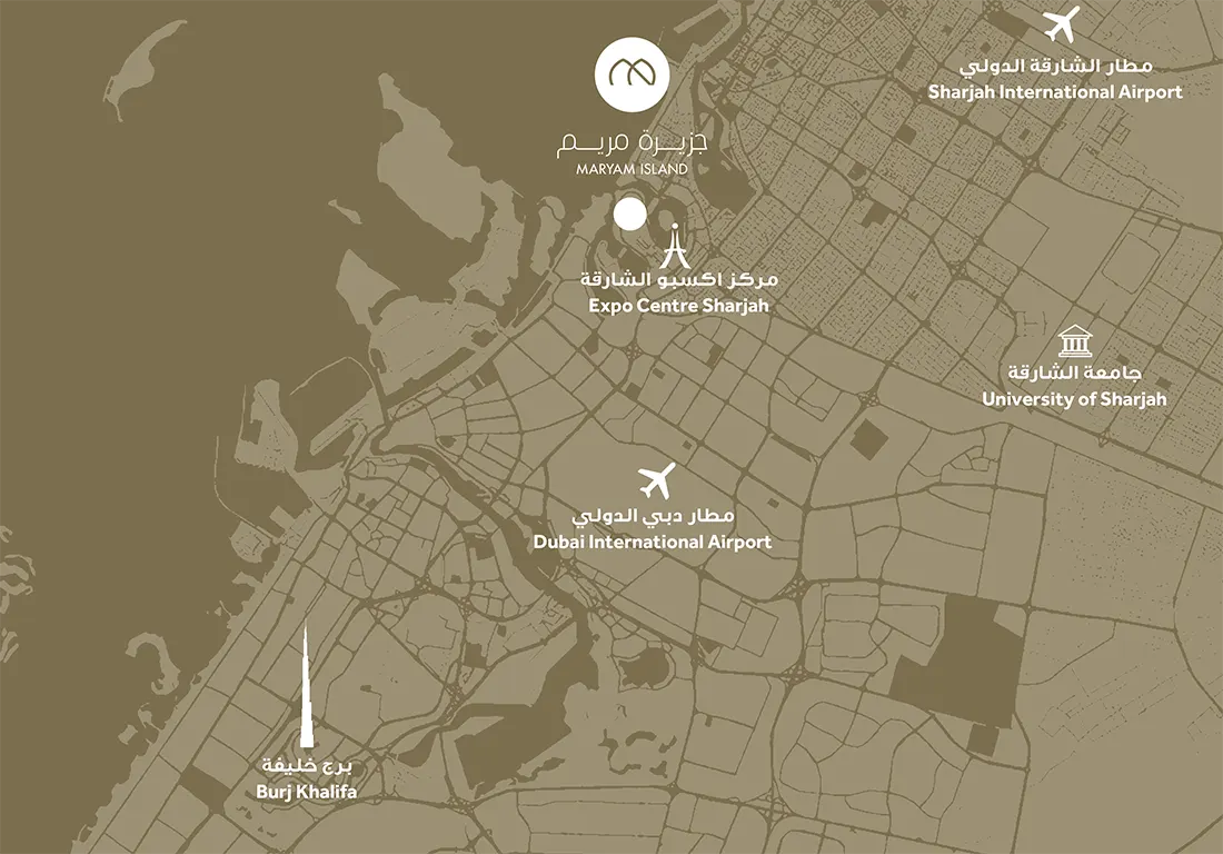 The complex is located on Maryam Island, Sharjah. It is one of the most popular locations in the city and is well connected to all parts of the city. Residents will have easy access to major facilities such as schools, colleges, hospitals, retail outlets, restaurants, hotels, entertainment venues and more.