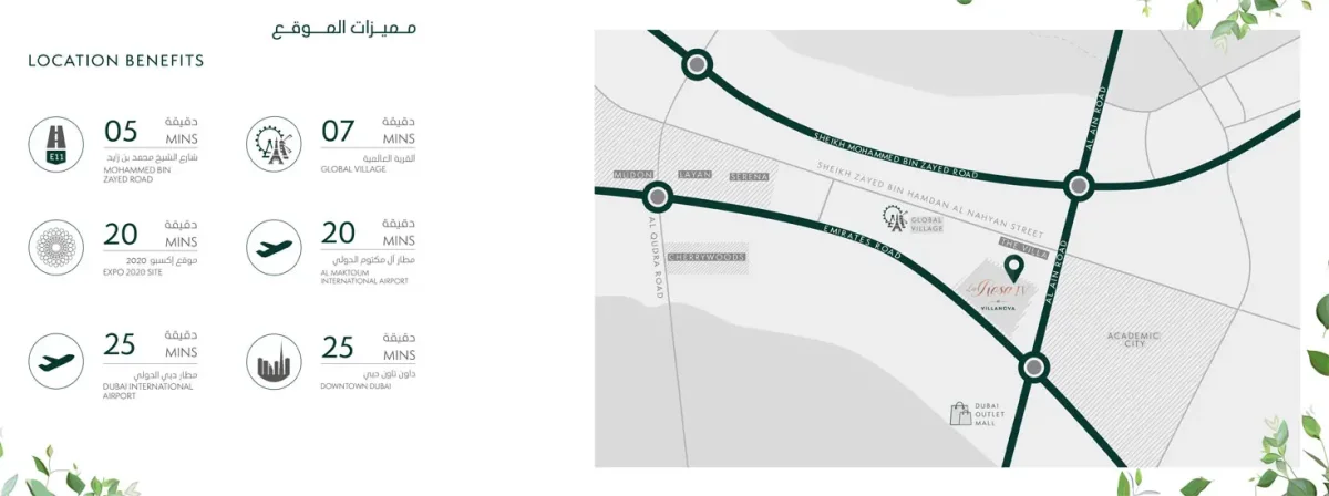 La Rosa Phase 4 is located in Villanova, Dubailand, which offers a central location in the heart of Dubai. Its proximity to major networks, including access to Emirates Road and Sheikh Zayed Bin Hamadan Al Nahyan Road, provides easy access to the rest of Dubai. Residents will live in close proximity to major attractions, leisure and entertainment venues, as well as major business centers.