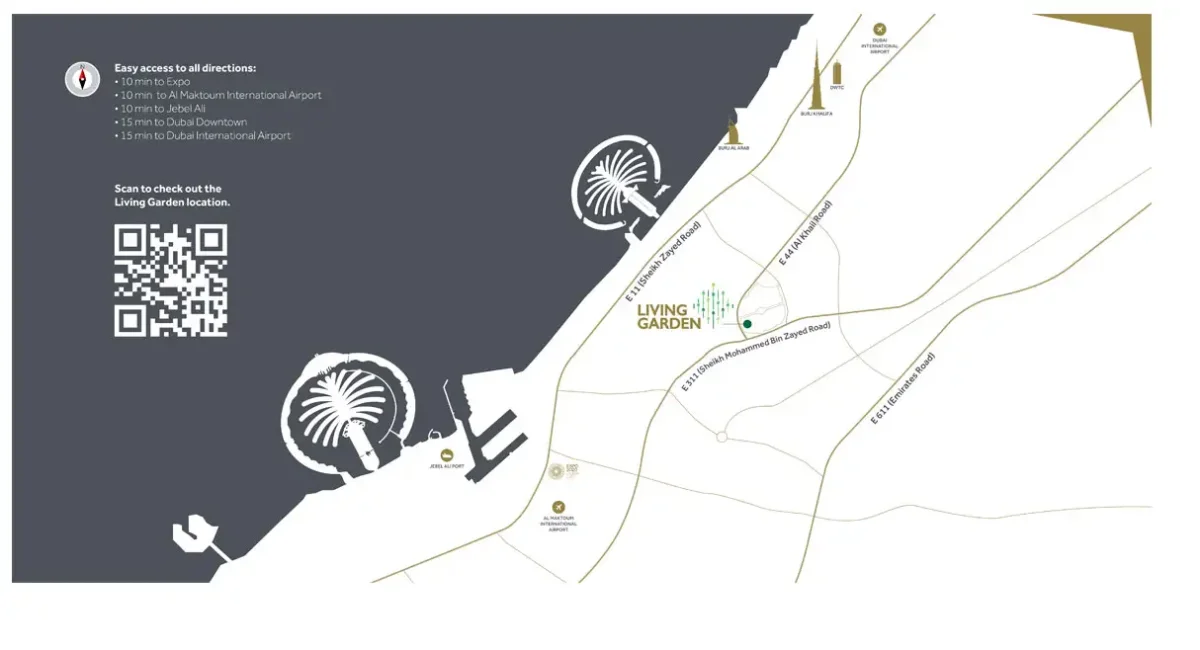 Located in the heart of Jumeirah Village Circle, Living Garden offers easy access to nearby road networks via Sheikh Mohammed Bin Zayed Road and Al Khail Road. JVC is a thriving community offering a modern lifestyle and a wide range of amenities.