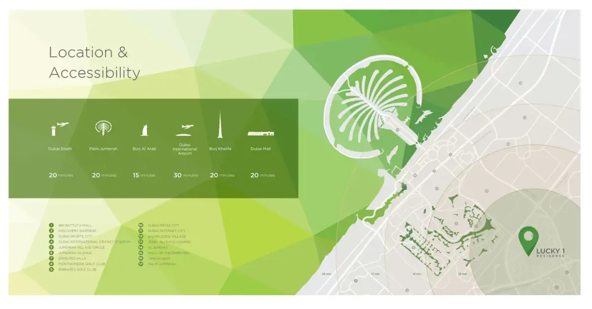 Lucky 1 Residences is conveniently located in Jumeirah Village Circle, Dubai, which offers a number of advantages of a central location. Residents have direct access to two major thoroughfares leading to Sheikh Mohammed Bin Zayed Road and Al Khail Road.