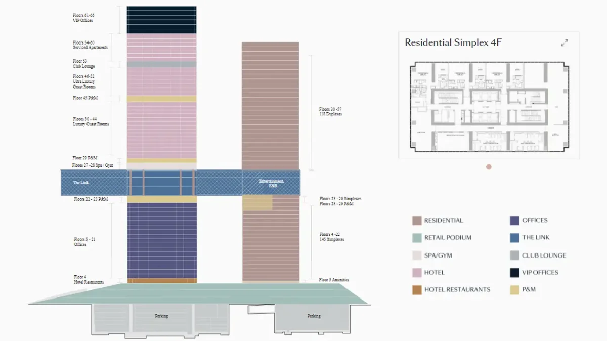 The innovative design of the twin towers allows you to find yourself in an amazing high-rise skyscraper with first-class amenities. The first tower is 300 meters tall and houses office space and hotels, while the second tower is 235 meters tall and houses luxury designer serviced residences.