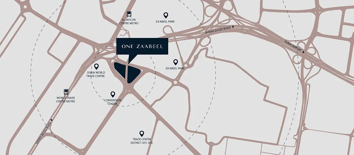 One Za'abeel is located near the Dubai Canal, Dubai International Financial Center and major attractions. The project marks a presence in Dubai and offers residents the opportunity to be part of the world's longest cantilevered tower. With its central location in the city, residents will live near famous places with access to everything.