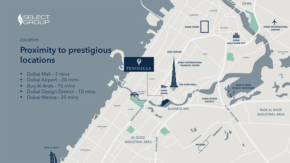 Peninsula Four The Plaza by Select Group is a new luxury development offering apartments from studios to 4 bedrooms, penthouses and lofts in Business Bay, Dubai. The two 52-story high-rise towers will be the centerpiece of the vibrant waterfront and will include 16 premium two-level lofts.