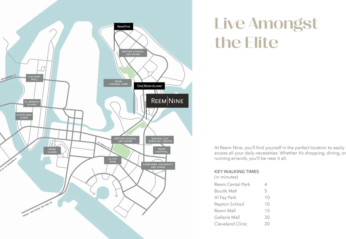 Reem Nine is located on a canal near Al Reem Island, Abu Dhabi. It is one of the most interesting and vibrant communities for residents who want to live in love with nature, and with the modern elements of life. A grand aura that comes to enhance your life with beaches, sandy rest areas, jogging, walking areas, dining areas and places to relax.