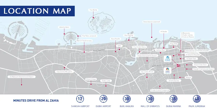 Sharjah Airport - 12 minutes awayDubai Airport - 20 minutes awayDubai Marina - 35 minutes awayPalma Jumeirah - 40 minutes awayBurj Khalifa and Mall of Emirates 30 minutes away