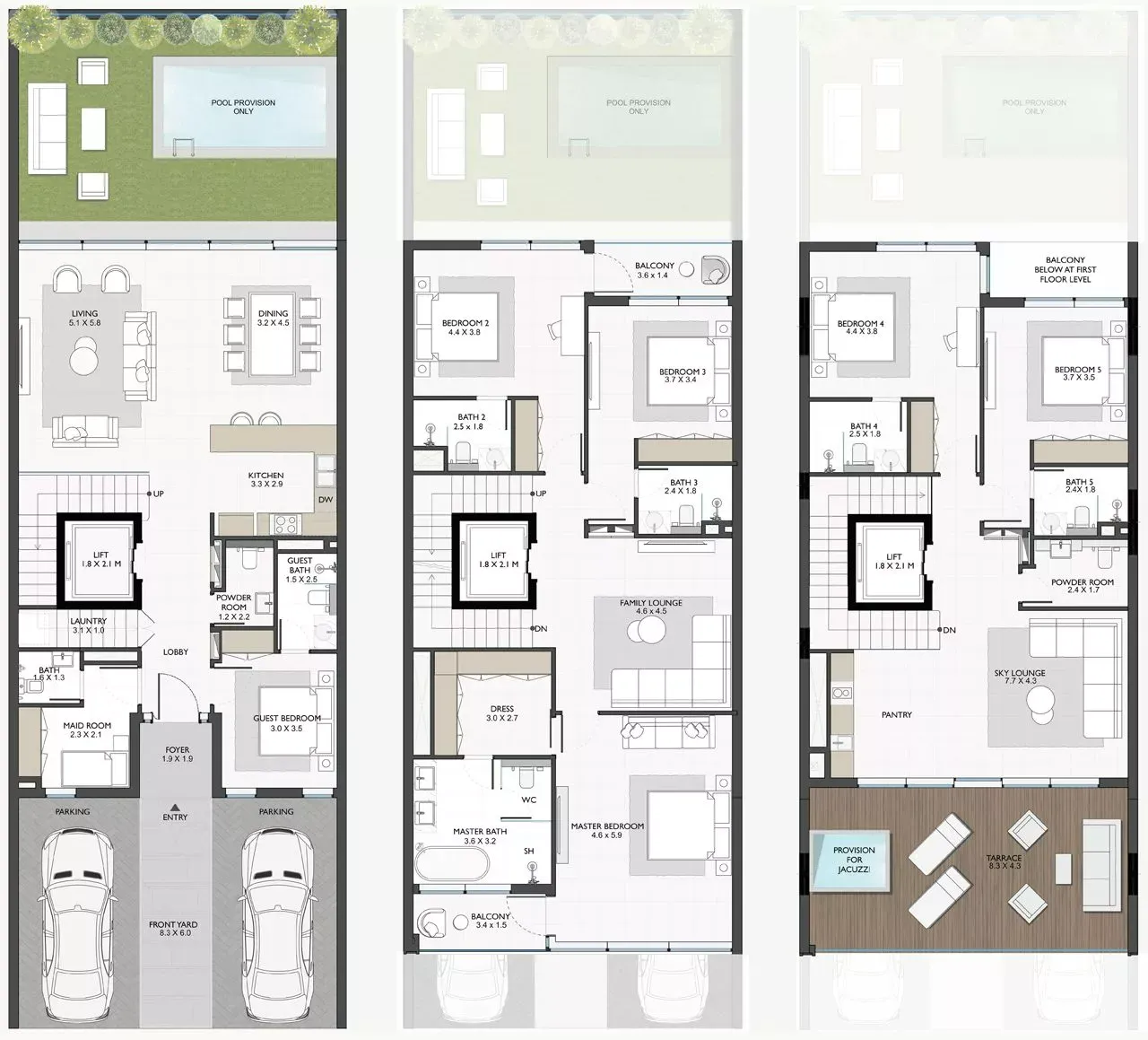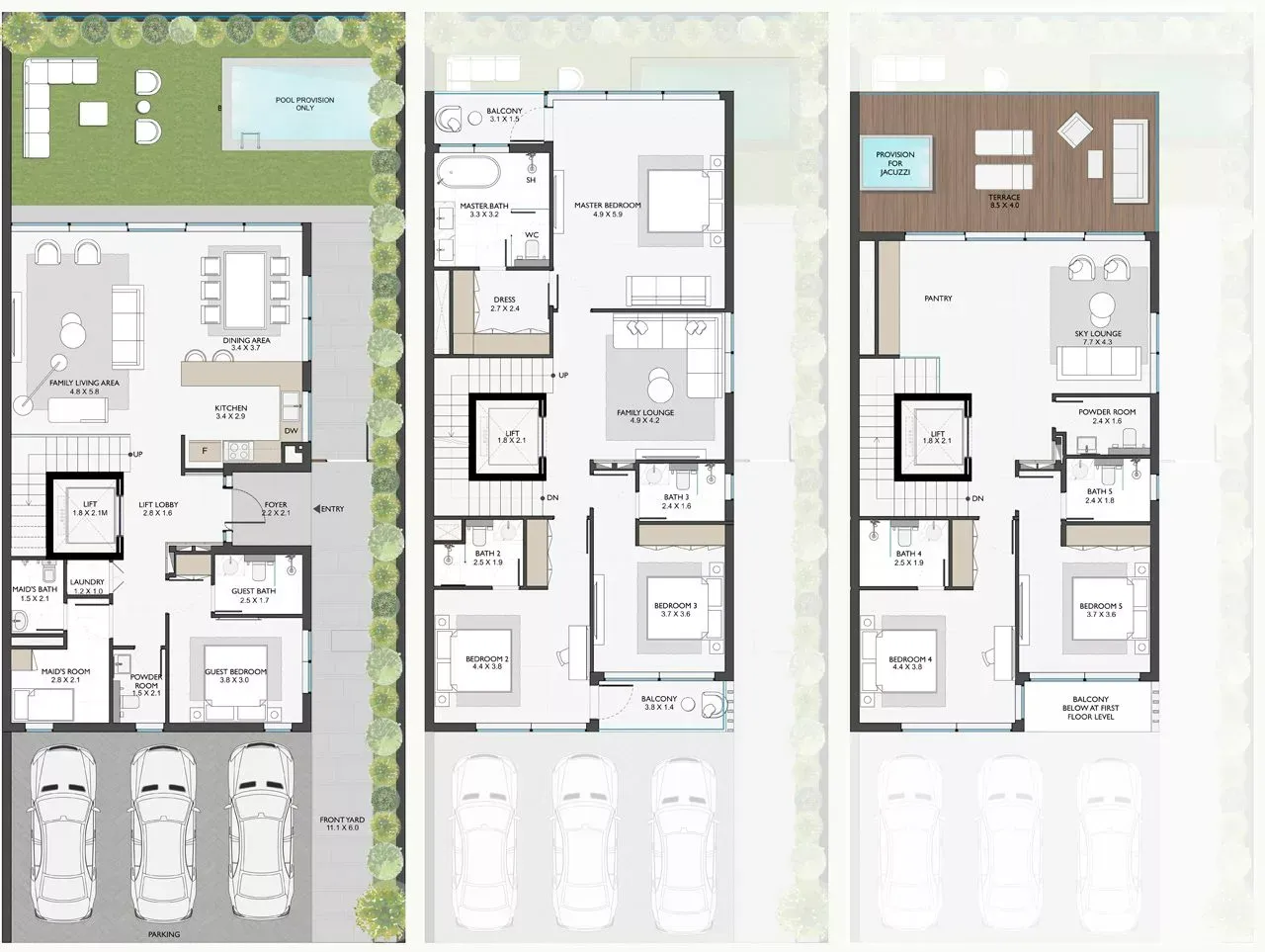 В проекте представлено 84 резиденции – отдельные и двухквартирные виллы с шестью спальнями и таунхаусы с шестью спальнями. Все дома будут иметь захватывающий вид на пышную зелень. Площадь просторных резиденций начинается от 434 кв.м. до 746 кв.м.